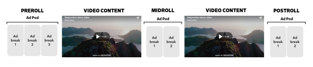 The Dailymotion Player supports ad pods created via Google Ad Manager only.