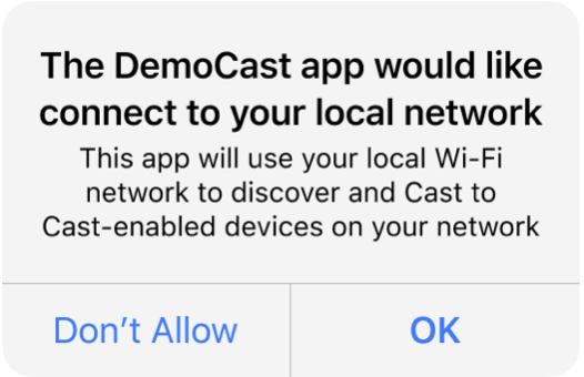 network.</string>This prompt appears as part of the iOS Local Network Access dialog the first time users try to cast from your app.