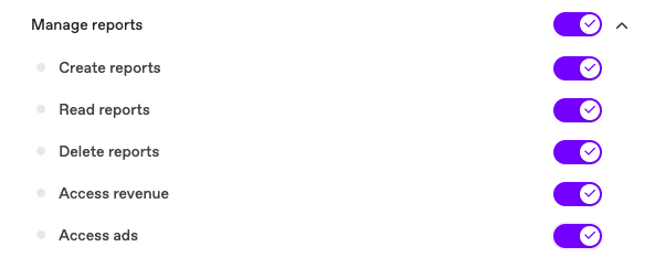 While creating your private API key, make sure to toggle on any permissions you may need in the “Manage reports” section: