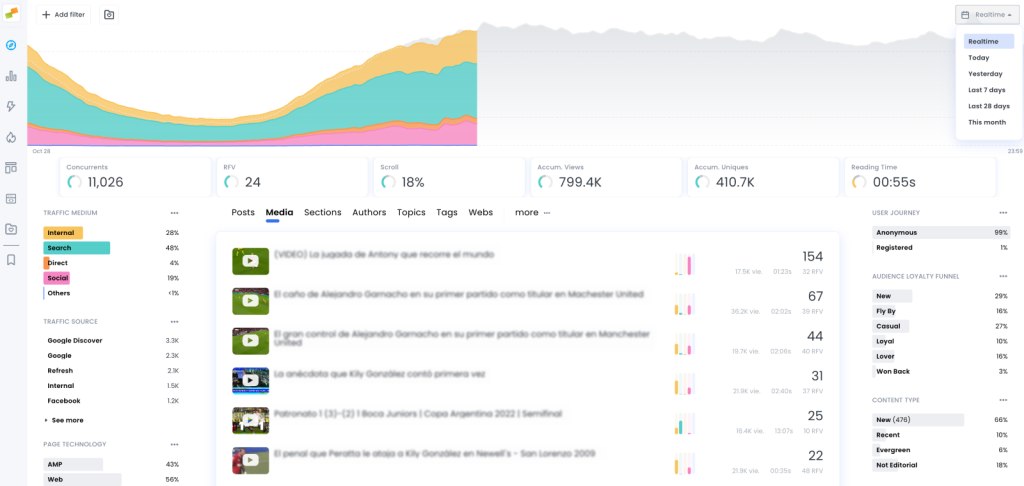 With Marfeel dashboards, your Dailymotion Player data are available in real-time and historical views across all modules, channels, and devices, without the complexities of intricate setups. This no-code integration makes it effortless to leverage the power of your Dailymotion Players, enabling the creation of impactful content that not only attracts larger audience but also delivers personalized experiences, ultimately optimizing overall outcomes.